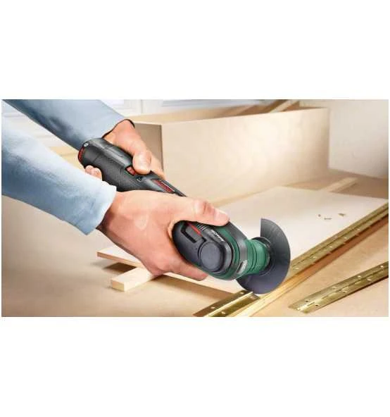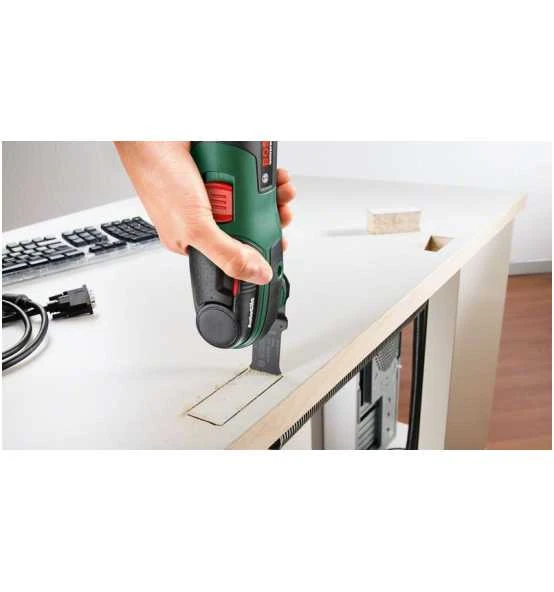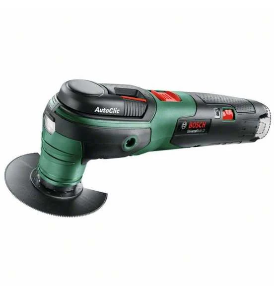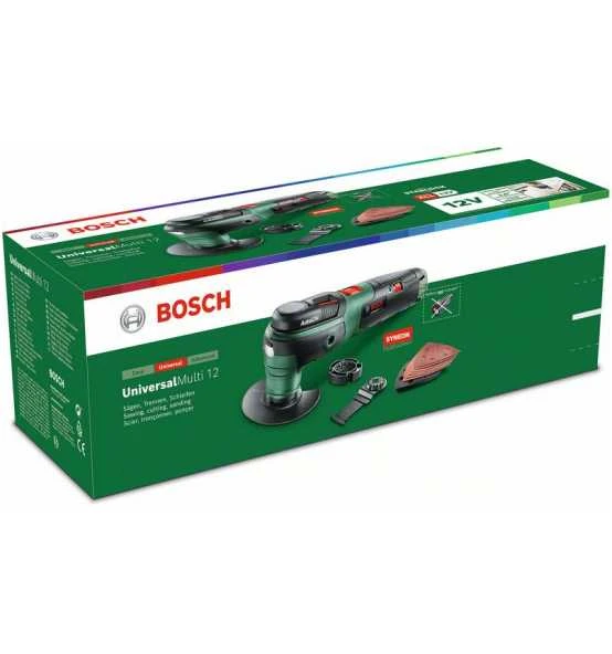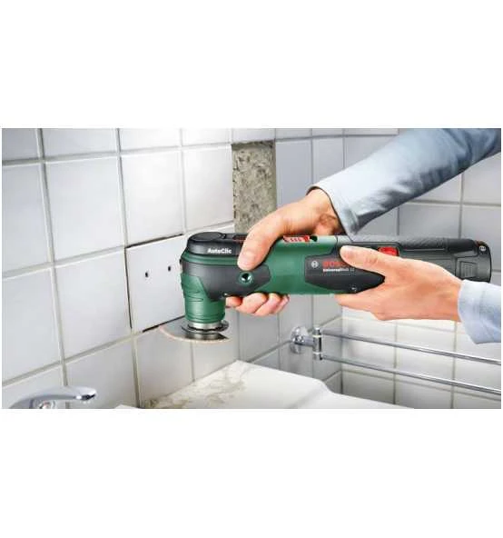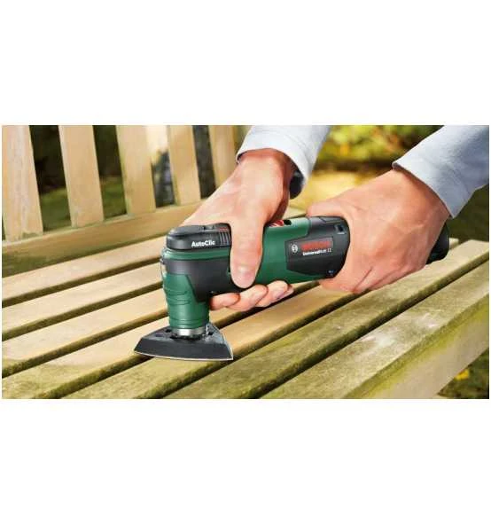 Akku-Multifunktionswerkzeug UniversalMulti 12. Vielseitige, kabelfreie Lösung für verschiedenste DIY-Arbeiten. Leistungsstarker Motor mit elektronischer Drehzahlvorwahl. Bosch AutoClic-System ermöglicht schlüssellosen Zubehörwechsel innerhalb von 3 Sekunden. Es ist umfangreiches Starlock-Zubehör für vielfältige Anwendungen erhältlich. Integrierte LED für die Beleuchtung des Arbeitsbereichs. Schneiden, Sägen, Schleifen, Schaben, Fräsen, Raspeln und Polieren verschiedenster Materialien. POWER FOR ALL: Ein Akku und ein Ladegerät für das komplette Home & Garden-Gerätesystem. Syneon Technology steuert den Energieverbrauch für optimale Effizienz und längere Laufzeit. Im Lieferumfang enthalten: ACZ 85 EB (2 609 256 943), AIZ 32 EPC (2 609 256 947), Deltaschleifplatte 93 mm, AVZ 93 G (2 609 256 956), Deltaschleifblatt-Set (2 609 256 A54), 4-stufiger Tiefenanschlag für Segmentsägeblätter (2 609 256 C61), Tragekoffer