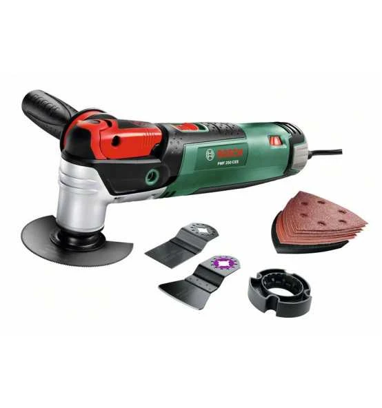 Multifunktionswerkzeug PMF 250 CES Set. Der kraftvolle Allrounder PMF 250 CES Sägen, Trennen, Schleifen und Schaben, selbst an schwer zugänglichen Stellen. Flexibel einsetzbar durch eine Vielzahl von Zubehörteilen. Ein wahres Multitalent, besonders wenn es ins Detail geht. Bosch-SDS-System schneller und einfacher Zubehörwechsel ohne Schlüssel. Kraftvoller 250-Watt-Motor leistungsstark mit Softstart. Bosch Constant-Electronic sorgt für eine gleichbleibend hohe Leistung auch unter Belastung. Stufenlose Schwingzahlvorwahl für materialgerechtes Arbeiten. Oszillation: 15.000 20.000 Schwingungen pro Minute in 2,8 Winkelgraden. Mit 4-stufigem Tiefenanschlag zur Begrenzung der Schnitttiefe. Mit Zusatzhandgriff zur optimalen Führung. Möglichkeit zum Anschluss für Allzwecksauger für staubfreies Schleifen. Im Lieferumfang enthalten: BIM Segmentsägeblatt Wood and Metal, 85 mm, ACZ 85 EB (2 609 256 943), Carbide Tauchsägeblatt, Metall, 40 x 32 mm, AIZ 32 AT (2 609 256 C65), Deltaschleifplatte 93 mm, AVZ 93 G (2 609 256 956), Deltaschleifblatt-Set (2 609 256 A54), Staubabsaugung (2 609 256 D57), HCS Mehrblatt, 24 x 11 mm, ASZ 32 SC (2 609 256 D22)