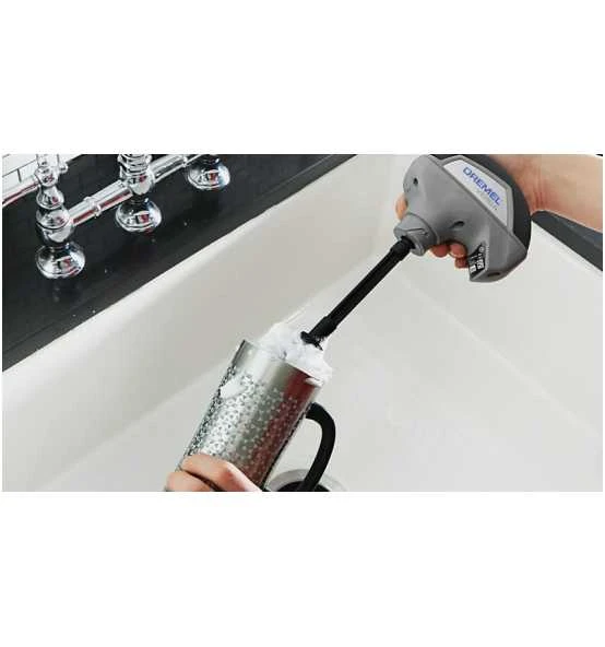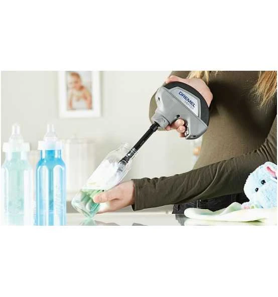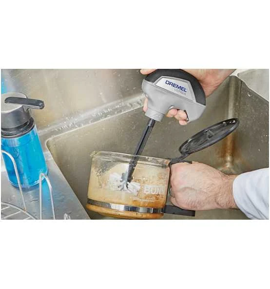 DREMEL PC372 Versa Küchenbürste. Die Küchenbürste ist perfekt für die Reinigung empfindlicher Gegenstände, ohne diese zu zerkratzen. Die Dremel Versa Küchenbürste entfernt schnell Lebensmittelreste, ohne die Oberfläche zu verkratzen. Mit ihren langlebigen, waschbaren Nylonborsten kann die Küchenbürste für viele Reinigungsarbeiten verwendet werden. Dank der enthaltenen Verlängerung (10 cm) kann der Boden von Gläsern, Flaschen und Bechern einfach erreicht und gründlich gereinigt werden. Die vorderen Borsten reichen bis an den Flaschenboden zur effektiven Reinigung von Innenkanten und schwer zugänglichen Stellen. Die Küchenbürste ist perfekt für die Reinigung empfindlicher Gegenstände und das schnelle Entfernen von Lebensmittelresten, ohne Kratzer zu hinterlassen. Erledige alltägliche Aufgaben wie das Reinigen einfacher Becher, Gläser und Flaschen wie auch das Schrubben von Töpfen, Pfannen und Tellern. Mehr reinigen mit weniger Mühe. Die langen Nylonborsten erleichtern die gründliche Reinigung in Flaschen oder tiefen Töpfen, insbesondere in Kombination mit der Verlängerung (10 cm) zur mühelosen Reinigung schwer zugänglicher Stellen. Bereit für den Abwasch: Schraube einfach die Verlängerung auf deinen Dremel Versa und dann die benötigte Küchenbürste darüber. Und schon kann es losgehen! Die waschbare Küchenbürste ist perfekt für mehrfache Anwendung.
