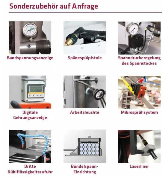 – Stabiler Graugussrahmen- Schraubstock-Schnellspanneinrichtung- Start-/Stopp-Funktion- Hartmetall-Sägebandführungen- Bandsägeblatt BI-Metall