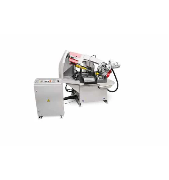 Automatische Bandsäge mit NC-Steuerung. Nach Programmieren der Stücklänge und Stückzahl wird der ganze Arbeitszyklus durchgeführt. Die Soll-Länge des zu schneidenden Materials ist auf der frei positionierbaren Bedienungstafel sehr einfach einstellbar. Der größte Vorteil dieser Anlage besteht in möglicher Programmierung verschiedener Stückzahl des zuschneidenden Materials mit unterschiedlichen Längen, ohne dass es nötig ist die Anlage weiter zu steuern. Der auf den linearen Führungen gelagerte Vorschubspannstock wird beidseitig geöffnet, wodurch Kollisionen bei unebenem Material vermieden werden. Das minimale Reststück in der automatischen Betriebsart beträgt 180 mm. In der Grundausstattung der Anlage sind zwei Sägebandgeschwindigkeiten enthalten, und zwar 40und 80 m/min.