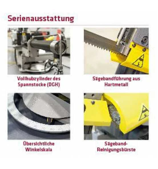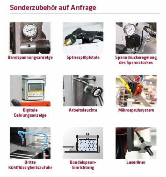 – Bandspannungsanzeige- Spänespülpistole- Spanndruckregelung des Spannstockes- Digitale Gehrungsanzeige- Arbeitsleuchte- Mikro-Sprüh-Einrichtung 24V- Dritte Kühlflüssigkeitszufuhr- Bündelspann-Einrichtung- LaserLiner-Lasermessleitlinie
