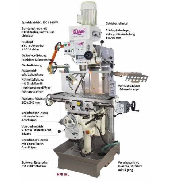 Das aus Gussmodulen aufgebaute, robuste Modell MFB 50 L bietet hoheStabilität und Flexibilität für eine intensive Nutzung im metallverarbei-tenden Gewerbe, Maschinen- und Werkzeugbau.Die Maschine ist mit einem höhenverstellbaren Koordinaten-Kreuztischausgestattet. Begrenzbare, stufenlose Antreibe der X- und Y-Achseneröffnen viele Möglichkeiten für eine serielle, halbautomatische Be-arbeitung von Werkstücken.Hervorzuheben ist ein schwenk- und drehbarer Maschinenkopf mit extragroßer Ausladung, durch den eine Bearbeitung von langen oder sperri-gen, auch extern gespannten Werkstücken ermöglicht wird.Die Bedienung der MFB 50 L ist einfach und rasch erlernbar. Eine ein-zigartige Präzision und rationelles Handling wird mit der optional erhältlichen, digitalen Positionsanzeige von SINO erreicht.