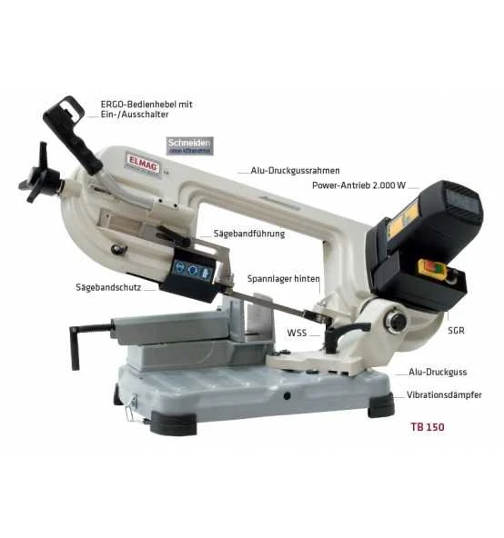– TB Metall-Bandsägemaschine- SGR Schnittgeschwindigkeitsregler- Standard-Drehschraubstock- Stangensperre mit Materialanschlag- WSS Winkelschnellspanner- Winkelskala- Ein-/Ausschalter- ERGO-Bedienhebel / Ein/Aus- Sägebandräder mit Präzisionslagern- Sägebandspanner- Sägebandführung vorne verstellbar- Spannlager vorne/hinten einstellbar- Sägeband- und Greifschutz- Nullspannungsauslösung- Sockel-/ Bügelgehäuse Alu-Druckguss- Transportkette mit Kettenhaken- Bandsägeblatt Bimetall Cobalt- Werkzeug/Betriebsanleitung/CE