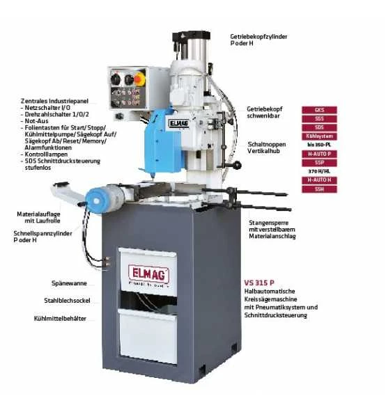 – VS Metall-Kreissägemaschine- H-Auto P Pneumatik halbautomatisch- Späneräumer Sägeblattreinigung- Materialauflage mit Laufrolle- Stangensperre mit Materialanschlag – GKS Getriebekopf schwenkbar- Winkelskala und Winkelsperren- Vertikalhub/Schnitttiefe einstellbar- SSS Schnellspannschraubstock- Antigrat-Werkstückhalter- SSP Schnellspanner pneumatisch- Hochleistungsantrieb/Ölbadgetriebe- Zentrales Bedienpanel- Folienpanel mit Betriebsindikatoren- SDS Schnittdrucksteuerung- Kühlsystem mit Elektropumpe- Sägeblattschutz- Not-Aus/Nullspannungsauslösung- Stahlblechsockel und Spänewanne- Werkzeug/Betriebsanleitung/CE