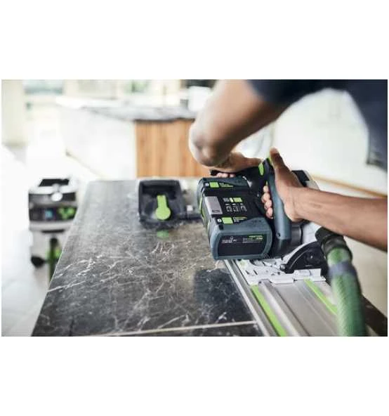 2 x Akkupack BP 18 Li 5,0 ASI, Schnellladegerät TCL 6 DUO, Kreissägeblatt WOOD FINE CUT HW 160×1,8×20 WD42, Splitterschutz, Sichtfenster, Staubfangbeutel, Innensechskantschlüssel SW 5, Führungsschiene FS 1400/2, Systainer SYS3 M 437