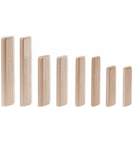 - Die seitlich überstehenden Führungsrippen zentrieren den Dübel mittig in der DOMINO Fräsung und sorgen somit für ein perfektes Ausrichten der Werkstücke