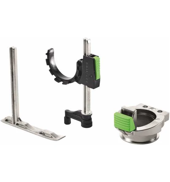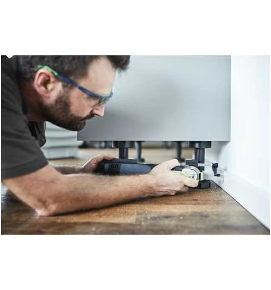 - enthält zwei Einsätze: drehbarer Tiefenanschlag für Eintauchschnitte und Gleitschuh für lange gerade Schnitte