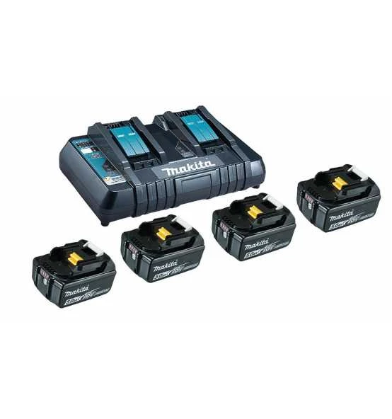 Power Source-Kit bestehend aus 4 Akkus BL1850B 5,0 Ah und 1 Doppel-Schnellladegerät DC18RD. Lieferung im Karton.