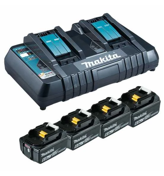 Power Source-Kit bestehend aus 4 Akkus BL1860B 6,0 Ah und 1 Doppel-Schnellladegerät DC18RD. Lieferung im Karton.