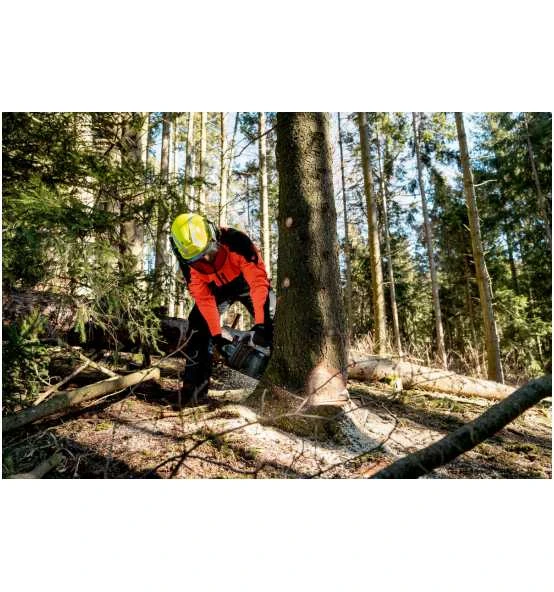 Durchzugsstarke Akku-Motorsäge für schnelle, gleichmäßige Schnitte beim Fällen, Entasten, Ablängen und Bauen mit Holz