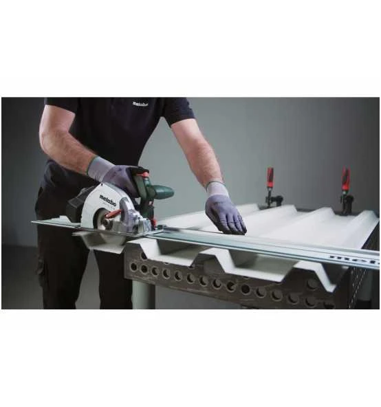 Durchzugsstarke Akku-Metallhandkreissäge mit Spänefangbox zum Kaltsägen von Metallen. Kompatibel zu Führungsschienen.