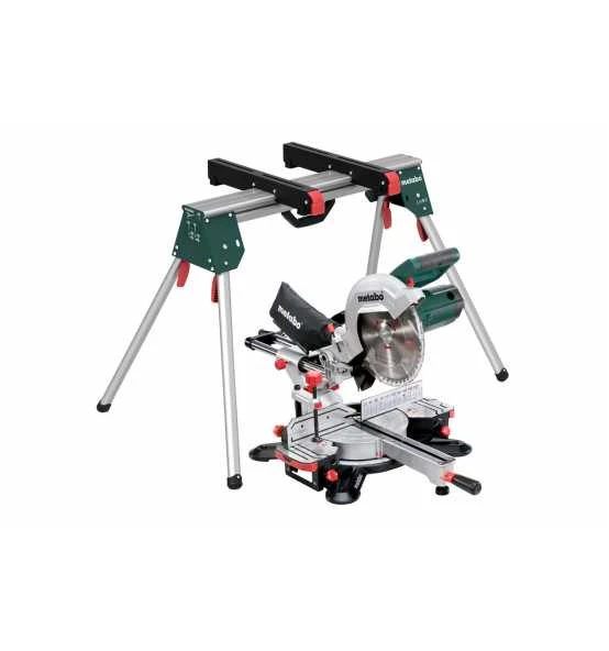Hartmetall-Sägeblatt (48 Zähne), 2 integrierte Tischverbreiterungen, Ablänganschlag, Materialklemme, Werkzeug für Sägeblattwechsel, Kabelaufwicklung, Spänefangsack, Maschinenständer KSU 100