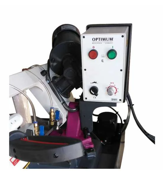 Bandsäge für die Metallbearbeitung mit gehrungsschwenkbarem Sägebügel und stufenlos einstellbarer Sägeband-Geschwindigkeit.